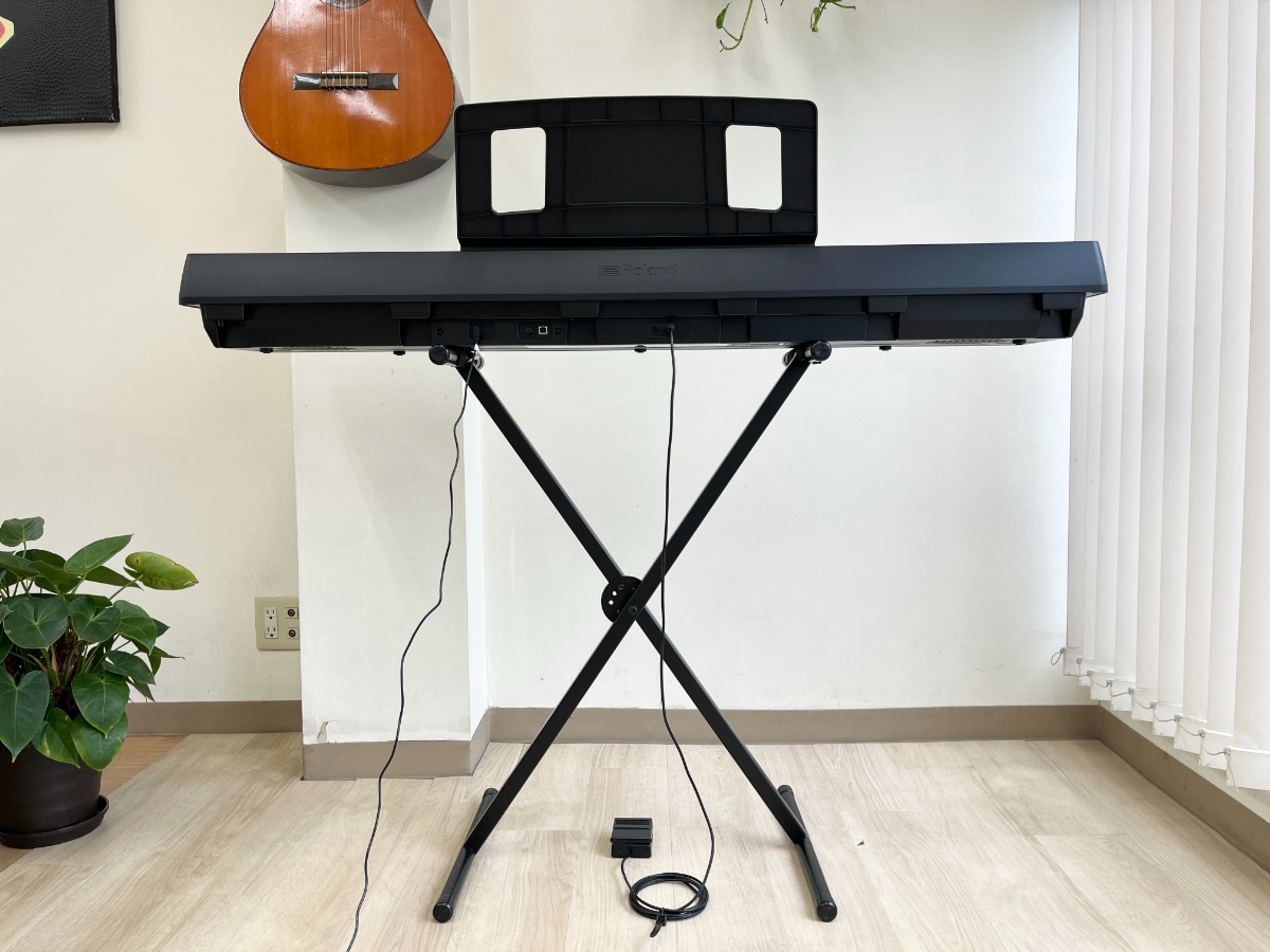鍵盤部分と、譜面台、ペダル1本、X型スタンド、電源アダプターがセットの商品となります。