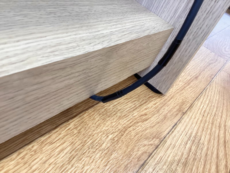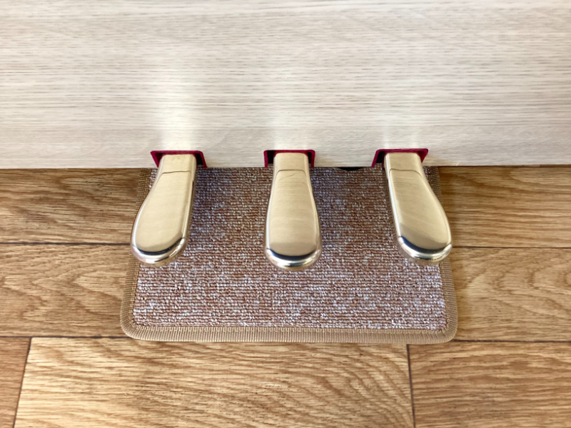 写真のように外装背面脚部分に浮き、ペダルコードの補強をしております。